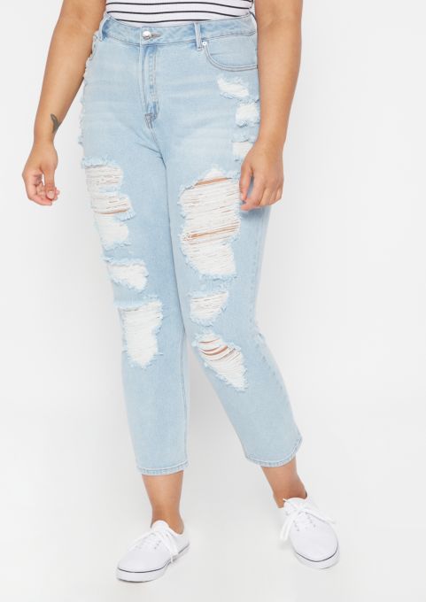Plus Throwback Light Wash Distressed Mom Jeans Plus Ripped Jeans