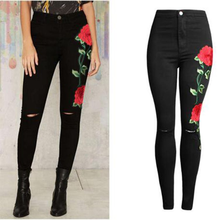 2020 Fashion Shipping Rose Embroidery Ripped Jeans For Women Plus