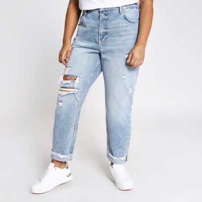 Plus Blue Ripped High Rise Mom Jeans River Island