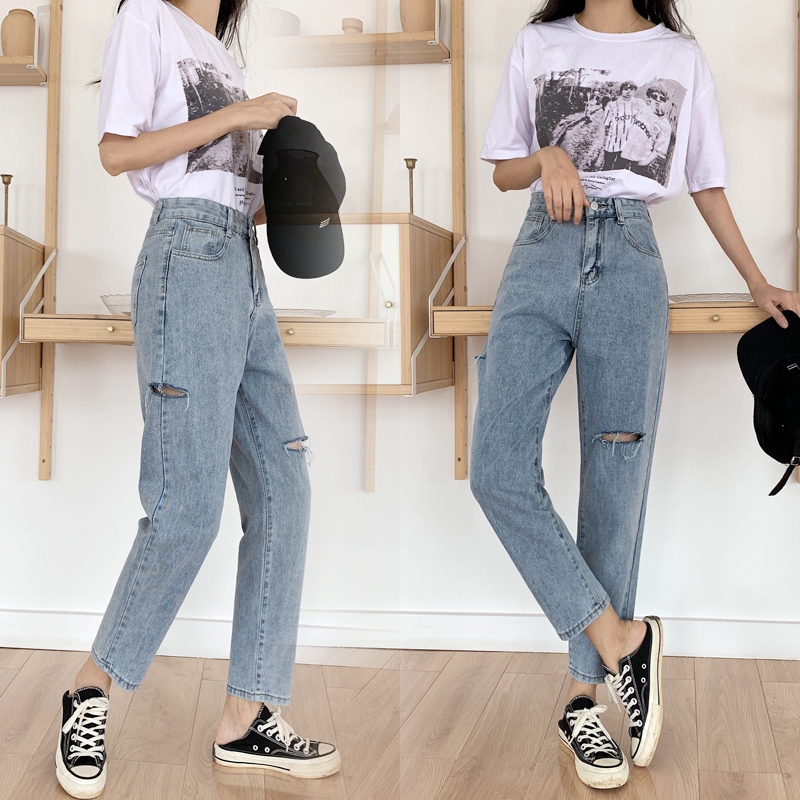 Korean High Waist Boyfriend Tattered Ripped Jeans Plus Size Skinny